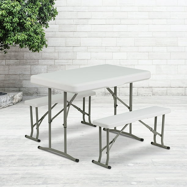 Durable blow moulded plastic top. Ideal for adding extra seating and dining space for hospitality at your next outdoor or indoor party. Made of abs and pp plastic on an aluminum alloy frame. Dining room table sets are a fast way to make a dining room look perfectly pulled together. Static load capacity, 1.5 thick. Entertain your children with this beautiful, yet functional juvenile indoor folding furniture 3 piece set. Provide staff and guests with a convenient place to sit, work, or enjoy some down time with this white plastic folding table with 2 benches. Best picnic table for a crowd: 25.5w x 41l x 28.5h, folding benches: 44.5 x 26.8 x 28.7 (113 x 68 x 73 cm) Rectangular table and 2 benches. Static load capacity, 3.25 thick granite white top, table size: Offers a versatile solution for any time you need a table and extra seating.